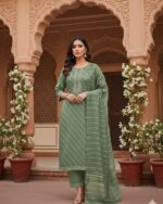 Step into elegance with this premium embroidered green suit set, crafted to bring a graceful and classy ethnic look for every festive and celebration moment. Made from soft, breathable and lightweight fabric, it offers a beautiful drape, comfort, and all-day wearability. The diagonal striped thread embroidery and delicate detailing add a luxurious festive charm to the entire outfit. Perfect for women who prefer subtle, premium and classy Indian wear.